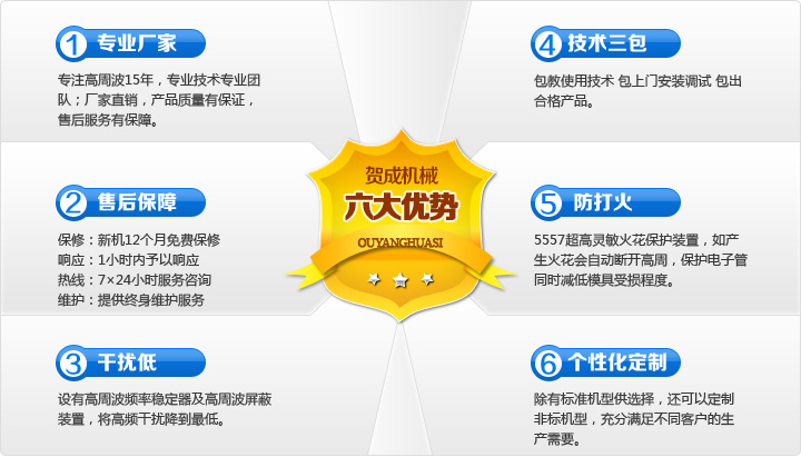 賀成機械專業(yè)生產(chǎn)高周波設(shè)備、精制高周波模具、供應(yīng)高周波配件和耗材、提供高周波維修、高周波加工及高周波出租服務(wù)。專注高周波15年,為廣大高周波用戶提供一站式采購、服務(wù)平臺。